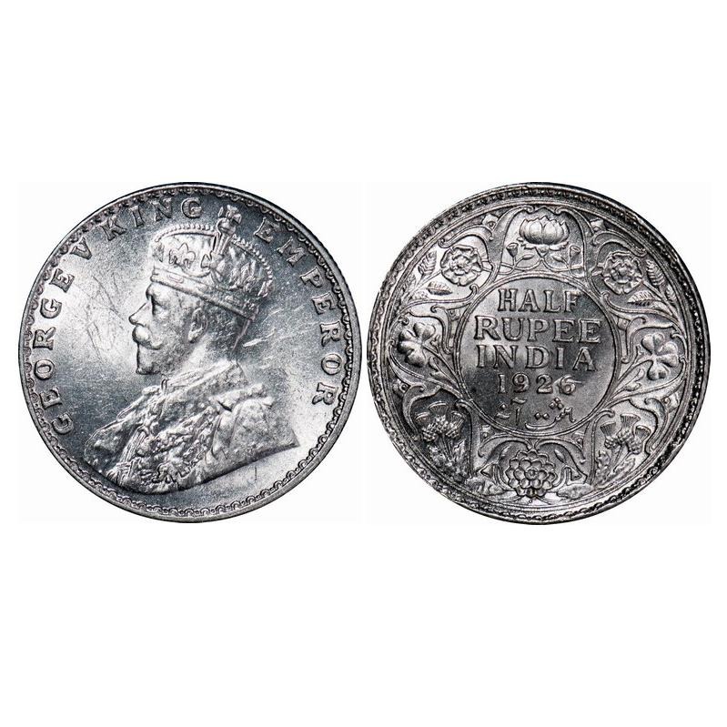 George V, Silver, Half Rupee, (2 coins), 1926, 1) Calcutta Mint, No dot, 2) Bombay Mint, Dot. F. Pr...
