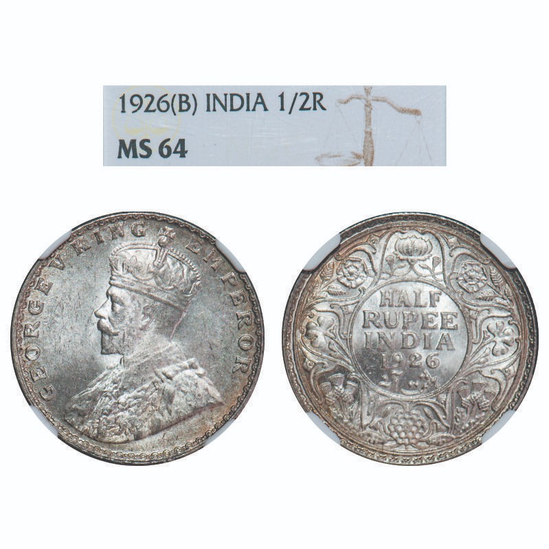 George V, Silver, Half Rupee, 1926, Bombay Mint, Dot. F. Prid 348. GK 1068. NGC Slabbed MS 64. Very Rare.