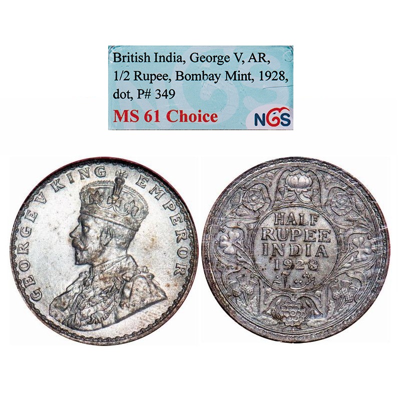George V, Silver, Half Rupee, 1928, Bombay Mint, Dot. F. Prid 349. GK 1070. NGS Slabbed MS 61. Rare.