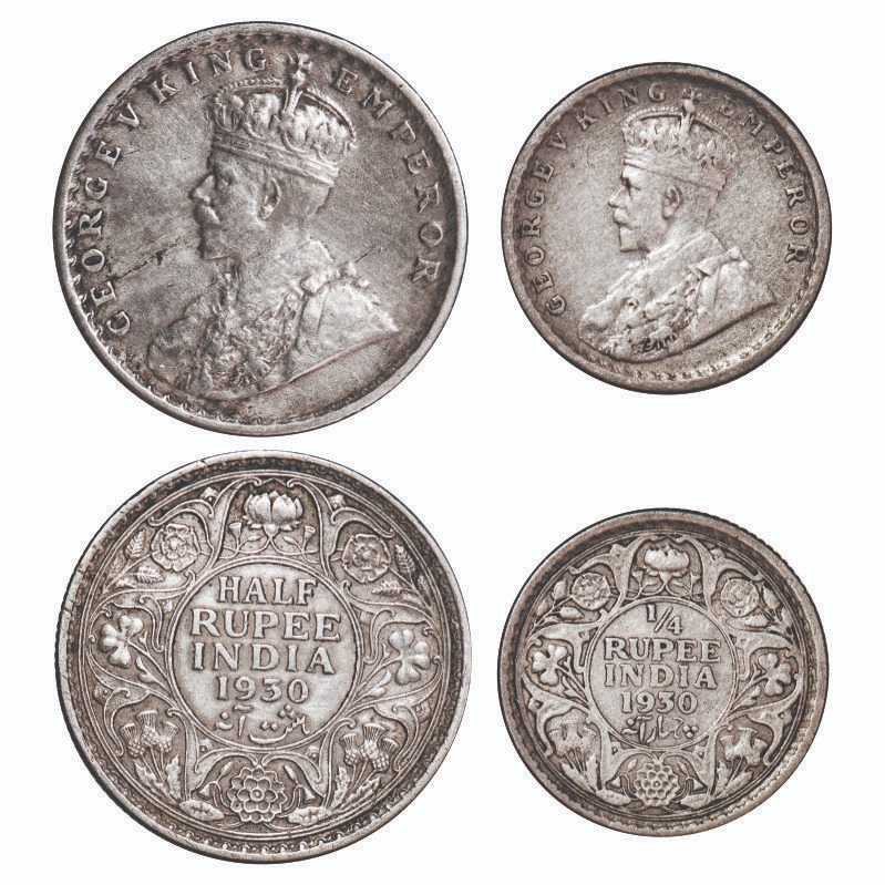 | George V, Silver, 1930, ( 2 coins), 1) Half Rupee, Calcutta Mint, No dot, 2) 1/4 Rupee, Calcutta Mint, No dot. F. Prid 332, 451. GK 1072, 1097. Very Fine to Extremely Fine. Scarce. |
