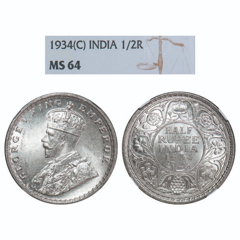 George V, Silver, Half Rupee, 1934, Calcutta Mint, No dot, Elephant. F. Prid 334. GK 1074. NGC Slabbed MS 64. Very Rare.