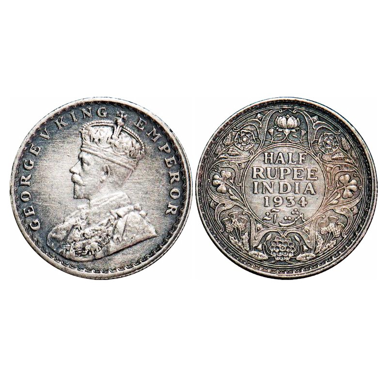 George V, Silver, Half Rupee, 1934, Calcutta Mint, No dot. F. Prid 334. GK 1074. Very Fine+. Scarce.
