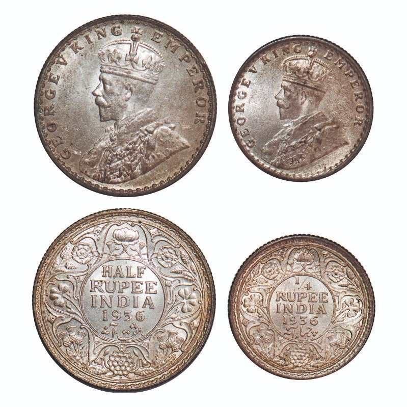 | George V, Silver, Half Rupee, 1/4 Rupee, (2 coins), 1936, 1) Bombay Mint Dot, 2) Calcutta Mint, No dot. F. Prid 350, 453. GK 1076, 1099. Uncirculated. Scarce. |