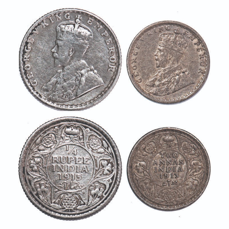 | George V, Silver, (2 coins), 1) 1/4 Rupee, 1915, Bombay Mint, Dot, 2) 2 Annas, 1913, Calcutta Mint, No dot. F. Prid 457, 566. GK 1088, 1110. Fine+ to Very Fine. Scarce. |