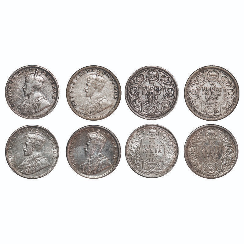 | George V, Silver, 1/4 Rupee, (4 coins), 1) 1915, Bombay Mint, Dot, 2) 1926, Calcutta Mint, No dot, 3) 1934, Calcutta Mint, No dot, 4) 1936, Bombay Mint, Dot. F. Prid 457, 449, 452, 460. GK 1088, 1094, 1098, 1100. Fine+ to Uncirculated. Scarce. |