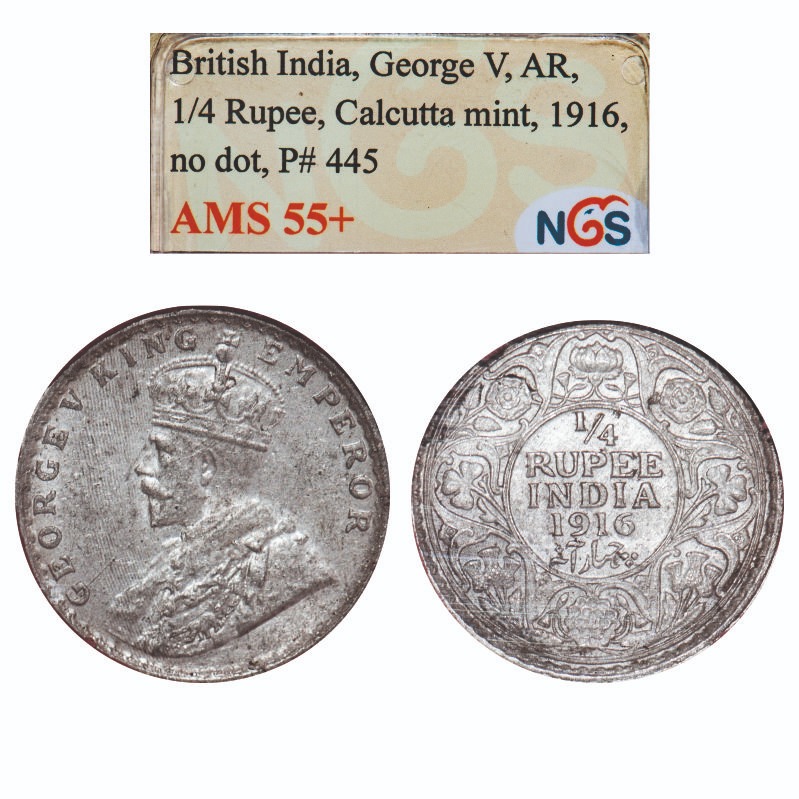 George V, Silver, 1/4 Rupee, (4 coins), 1) 1915, Bombay Mint, Dot, 2) 1926, Calcutta Mint, No dot, ...