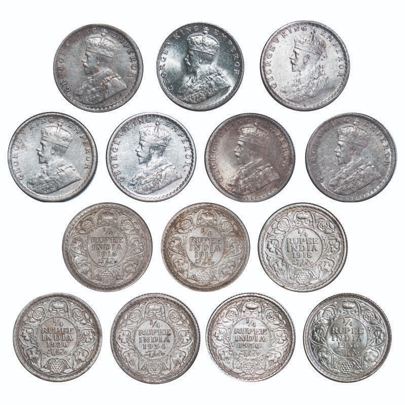 | George V, Silver, 1/4 Rupee, (lot of 7 coins), 1, 2, 3, 4, 5, 6) 1916, 1917, 1918, 1926, 1934, 1936, Calcutta Mint, No dot, 7) 1936, Bombay Mint, Dot. F. Prid 445, 446, 447, 449, 452, 453, 460. GK 1089, 1090, 1091, 1094, 1098, 1099, 1100. Very Fine+ to Brilliant Uncirculated. Scarce as a lot. |