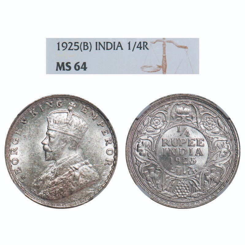 George V, Silver, 1/4 Rupee, 1925, Bombay Mint, Dot. F. Prid 458. GK 1093. NGC Slabbed MS 64. Very Rare.