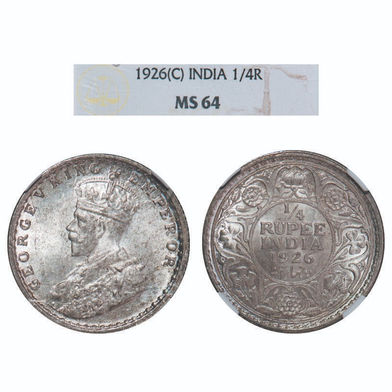 George V, Silver, 1/4 Rupee, 1926, Calcutta Mint, No dot. F. Prid 449. GK 1094. NGC Slabbed MS 64. Very Rare.