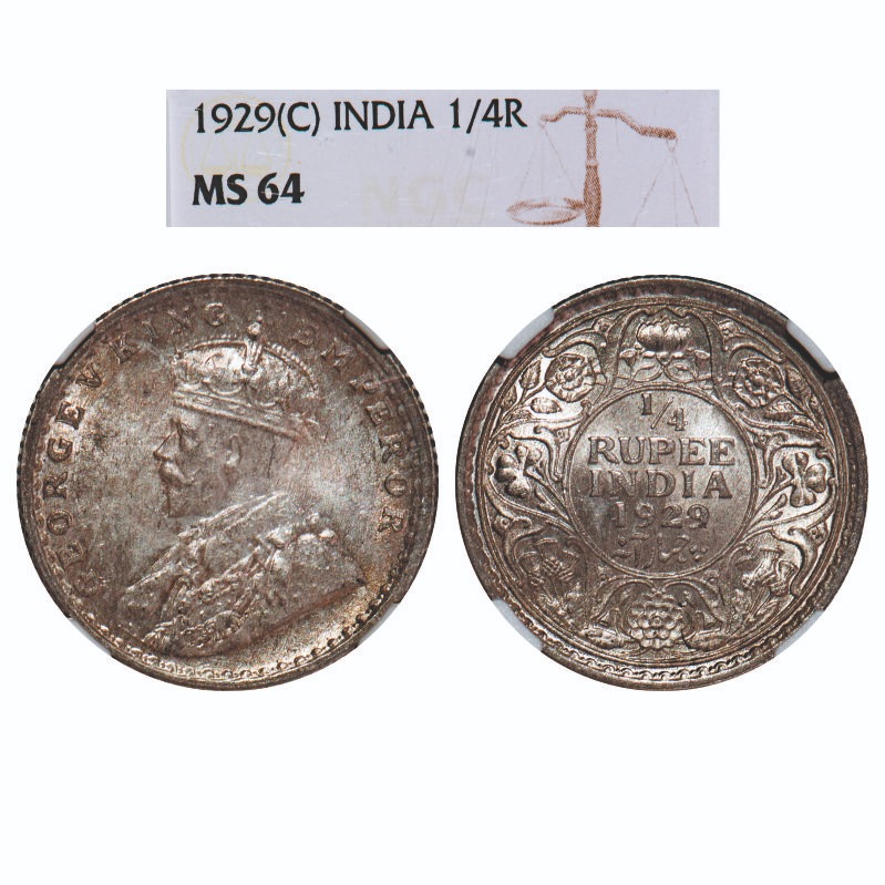 George V, Silver, 1/4 Rupee, 1929, Calcutta Mint, No dot. F. Prid 450. GK 1096. NGC Slabbed MS 64. Very Rare.
