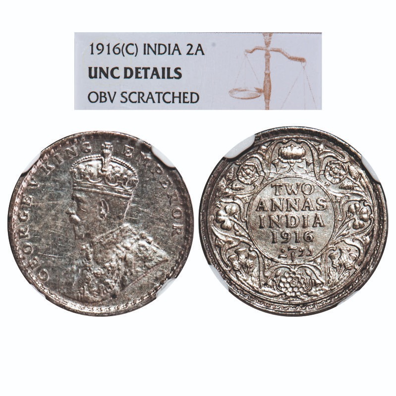 George V, Silver, 2 Annas, 1916, Calcutta Mint, No dot. F. Prid 569. GK 1116. NGC Slabbed UNC Details, Obv scratched. Scarce.