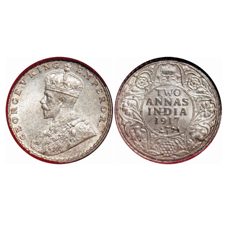 George V, Silver, 2 Annas, 1917, Calcutta Mint, No dot. F. Prid 570. GK 1117. NGS Slabbed MS 63 Brilliant. Rare.