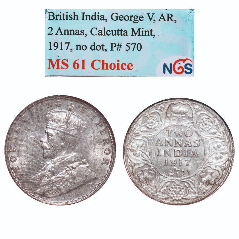 George V, Silver, 2 Annas, 1917, Calcutta Mint, No dot. F. Prid 570. GK 1117. NGS Slabbed MS 61 Choice. Very Scarce.