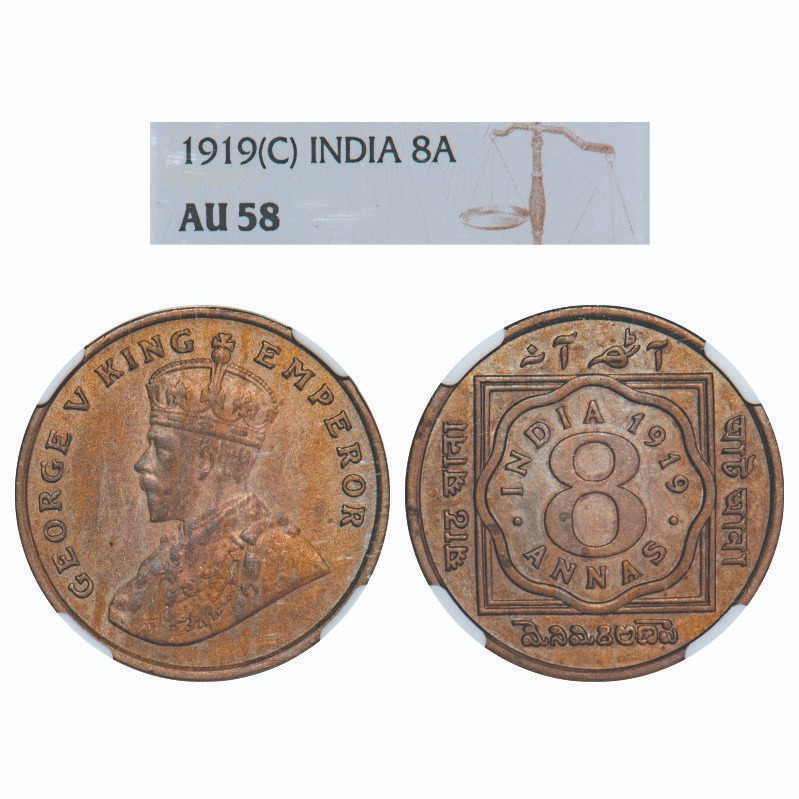 George V, Copper-Nickel, 8 Annas, 1919, Calcutta Mint, No dot. F. Prid. 870. GK 1077. NGC Slabbed AU 58. Very Scarce.