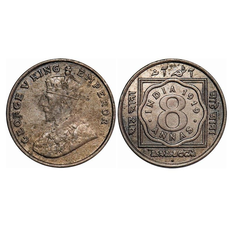 George V, Copper-Nickel, 8 Annas, 1919, Bombay Mint, Dot. F. Prid 872. GK 1078. Very Fine+. Scarce.