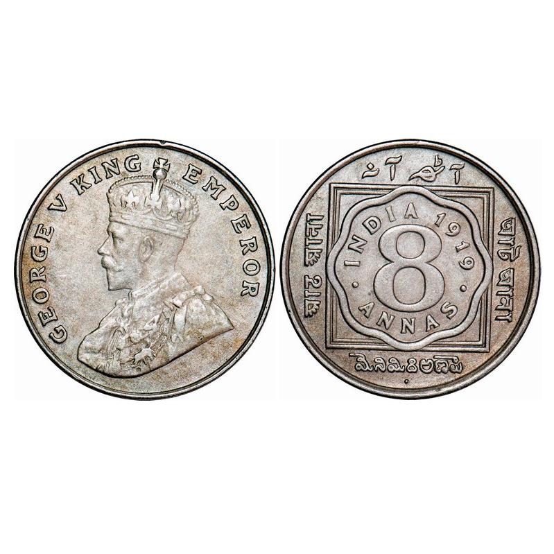 George V, Copper-Nickel, 8 Annas, 1919, Bombay Mint, Dot. F. Prid 872. GK 1078. About Uncirculated. Very Scarce.