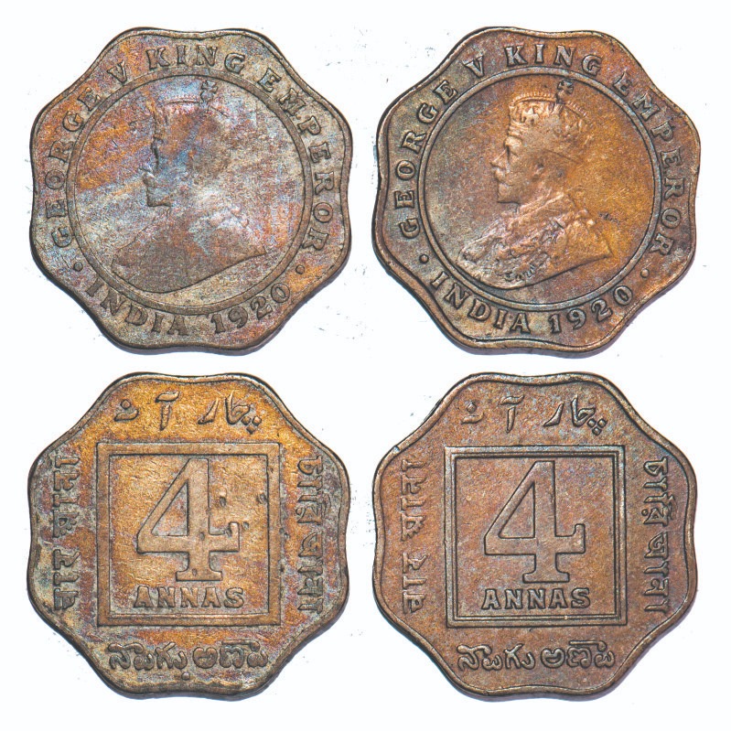| George V, Copper-Nickel, 4 Annas, (2 coins), 1) 1920, Calcutta Mint, No dot, 2) 1920, Bombay Mint, Dot. F. Prid 875, 878. GK 1103, 1104. Very Fine to Very Fine+. Scarce. |