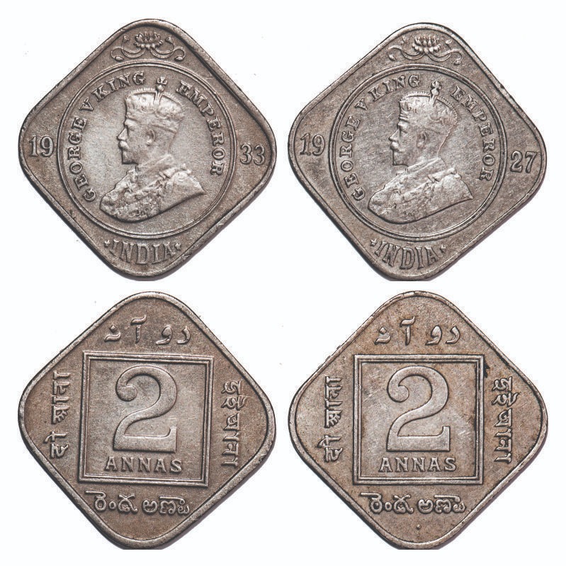 | George V, Copper-Nickel, 2 Annnas, (2 coins), 1) 1927, Bombay Mint, Dot, 2) 1933, Calcutta Mint, No dot, F. Prid 900, 891. GK 1131, 1136. Very Fine+ to Extremely Fine. Scarce. |