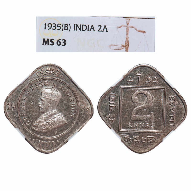 George V, Copper-Nickel, 2 Annas, 1935, Bombay Mint, Dot. F. Prid 902. GK 1139. NGC Slabbed MS 63. Rare.