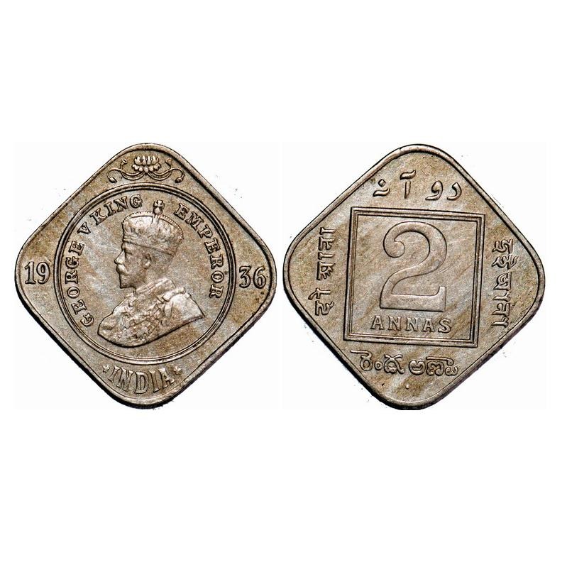 George V, Copper-Nickel, 2 Annas, 1936, Bombay Mint, Dot. F. Prid 903. GK 1140. Almost Uncirculated. Scarce.