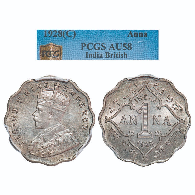 George V, Copper-Nickel, 1 Anna, 1928, Calcutta Mint, No dot. F. Prid 934. GK 1161. PCGS Slabbed AU 58. Very Scarce.