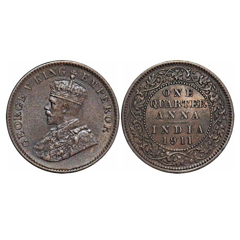 George V, Bronze, Quarter Anna, 1911, Calcutta Mint, No dot, Pig-Type. F. Prid 656. GK 1171. About Uncirculated. Very Scarce.