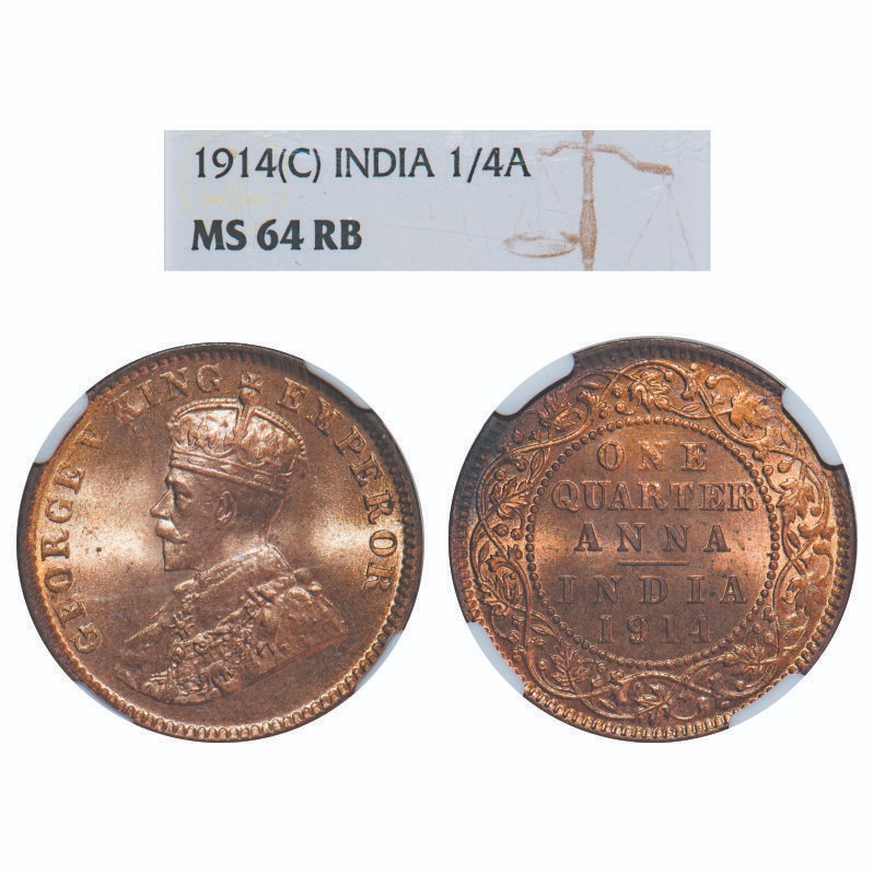 George V, Bronze, Quarter Anna, 1914, Calcutta Mint, No dot. F. Prid 660. GK 1174. NGC Slabbed MS 64 RB. Very Rare.
