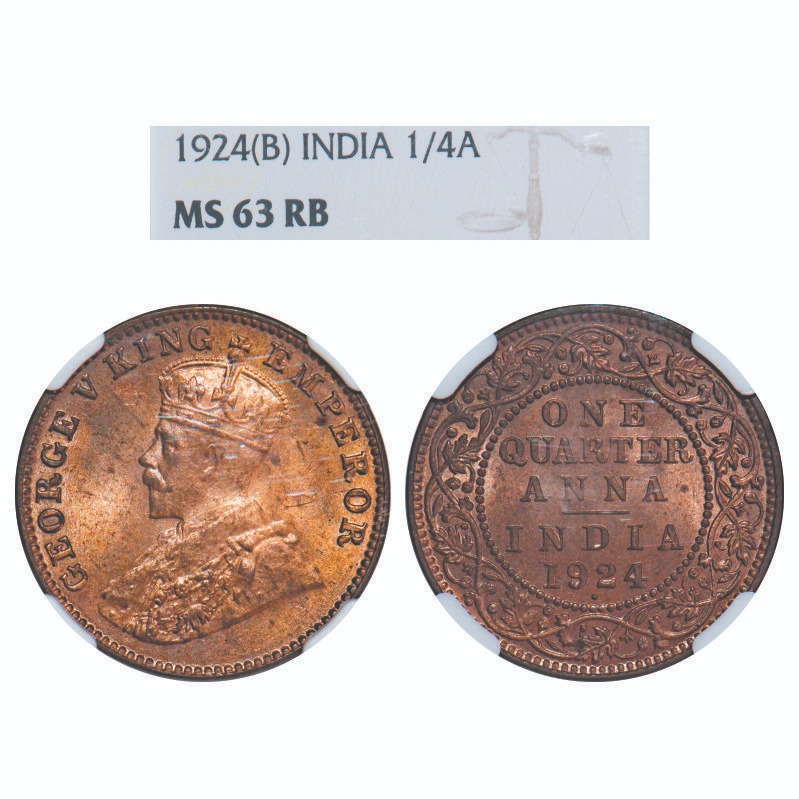 George V, Bronze, Quarter Anna, 1924, Bombay Mint, Dot. F. Prid 677. GK 1180. NGC Slabbed MS 63 RB. Rare.