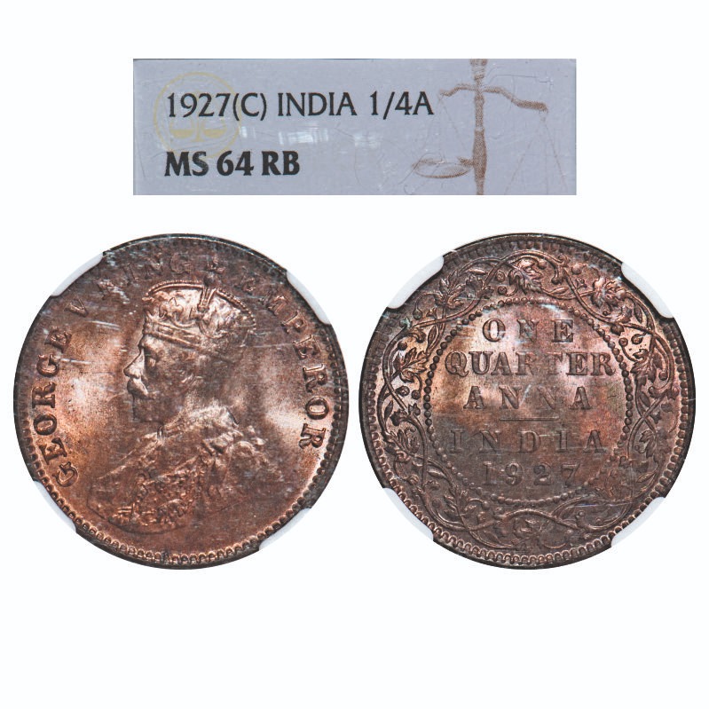 George V, Bronze, Quarter Anna, 1927, Calcutta Mint, No dot. F. Prid 668. GK 1186. NGC Slabbed MS 64 RB. Very Rare.