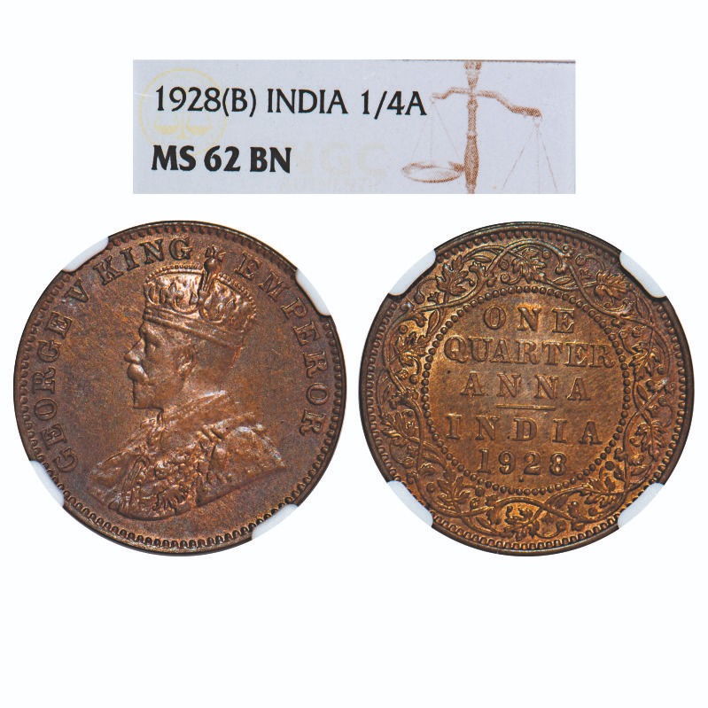 George V, Bronze, Quarter Anna, 1928, Bombay Mint, Dot. F. Prid 681. GK 1187. NGC Slabbed MS 62 BN. Very Scarce.