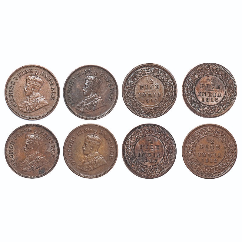 | George V, Bronze, 1/2 Pice, (4 coins), 1914, 1915, 1916, 1918, Calcutta Mint, No mint mark. F. Prid 747, 748, 749, 751. GK 1200, 1201, 1202, 1204. Extremely Fine to Uncirculated. Scarce. |