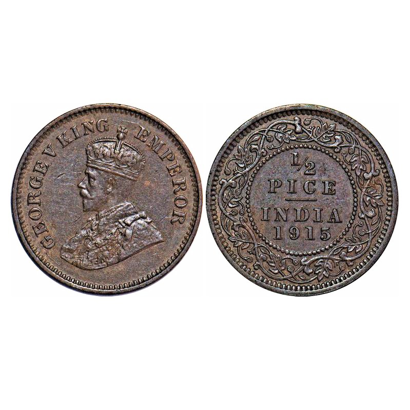 George V, Bronze, 1/2 Pice, 1915, Calcutta Mint, No mint mark. F. Prid 748. GK 1201. Almost Uncirculated. Very Scarce.