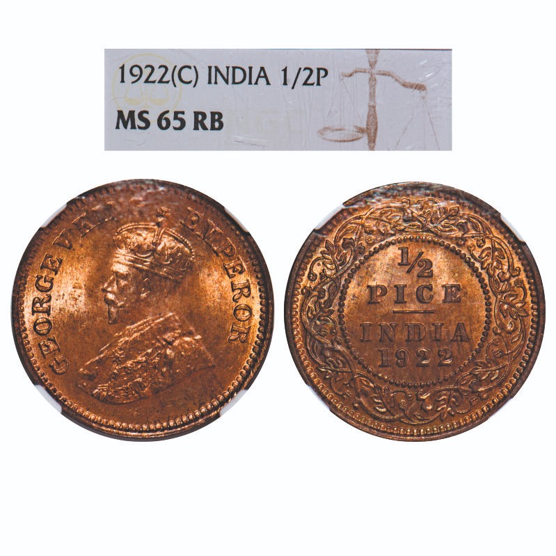 George V, Bronze, 1/2 Pice, 1922, Calcutta Mint, No mint mark. F. Prid 755. GK 1208. NGC Slabbed MS 65 RB. Rare.