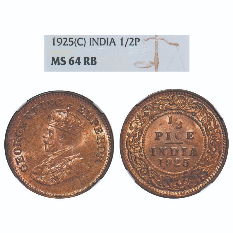 George V, Bronze, 1/2 Pice, 1925, Calcutta Mint, No mint mark. F. Prid 758. GK 1211. NGC Slabbed MS 64 RB. Rare.