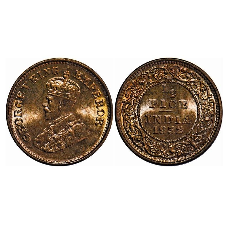 George V, Bronze, 1/2 Pice, 1932, Calcutta Mint, No mint mark. F. Prid 765. GK 1218. Brilliant Uncirculated. Very Scarce.
