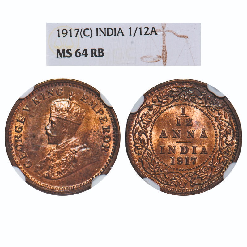 George V, Bronze, 1/12 Anna, 1917, Calcutta Mint, No dot. F. Prid 832. GK 1228. NGC Slabbed MS 64 RB. Rare.