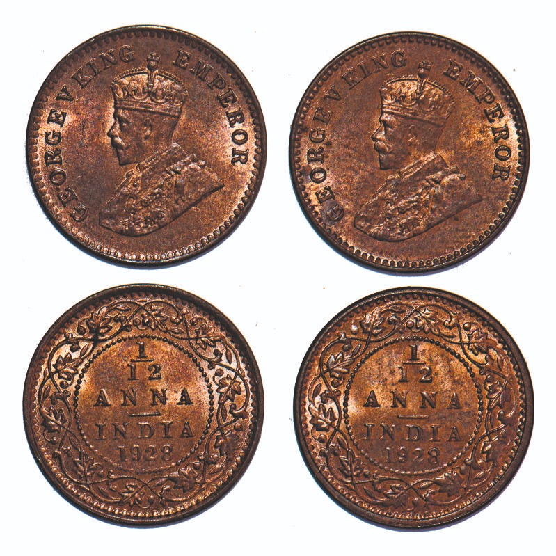 George V, Bronze, 1/12 Anna, (2 coins), 1928, Calcutta Mint, No dot. F. Prid 842. GK 1244. Uncirculated. Very Scarce.