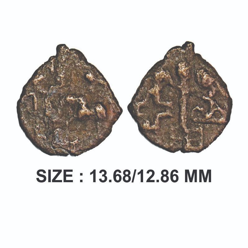Post Mauryan (c. 200 BC), Kaushmabi Region, Cast Copper, 1.02g, Obv: Elephant facing to left above taurine and indradhvaja symbol, Rev: Railed Tree in railing in centre, on right side three arched hill with crescent above taurine and on left side hollow cross. Very Fine, Very Scarce.