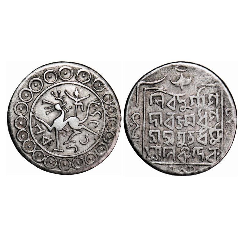 | Tripura, Silver Tanka, 10.84g, Dharma Manikya-II (SE 1636-1661 / 1714-1739 AD), Obv: Lion facing left with trident above, dated below, Saka 1636, within circle with outer border of beaded annulets. Rev: Siva Durga Pa/dabja Madhup/Sri Sri Dharma/ Manikya Devah, in square with ornamented border, Shiva Ling above. R&B (235) unlisted type. Broad Flan, Very Fine+, Extremely Rare. |