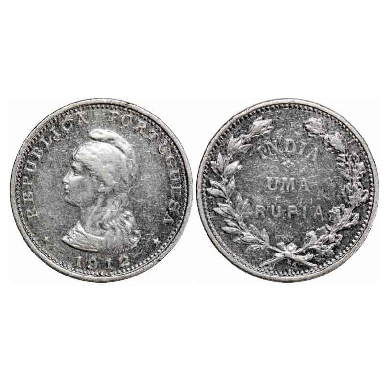 Indo Portuguese, Silver Uma Rupee, 11.64g, Republic (1910-1961 AD), 1912 AD. Obv: Bust & date, Rev: denomination Uma Rupia. A.Gomes (page 605) 09.01 / KM 18. Very Fine, Scarce.