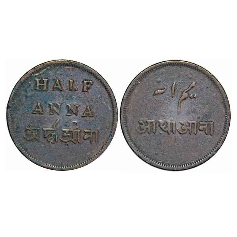 Bengal Presidency, Copper ½ Anna/ Nim Falus, 13.02g, (1831-1835 AD Isuue) Calcutta Mint. Reverse Die Inverted. P.Stevens 9.29 type / F.Prid 213. Fine, Scarce.