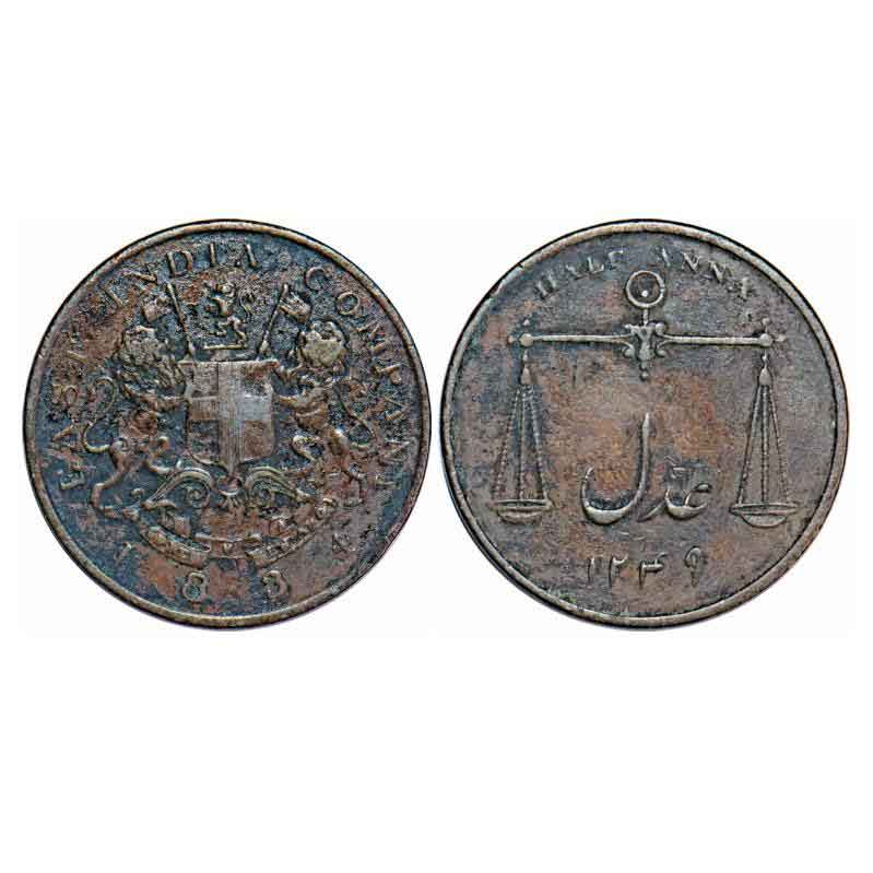 | Bombay Presidency, Copper ½ Anna, 12.91g, 1834 AD, Obv: Arms of EIC Company, Rev: Scales of equilibrium, denomination, persian date 1249. P.Stevens 5.31 / F.Prid 217, Fine+, Scarce. |