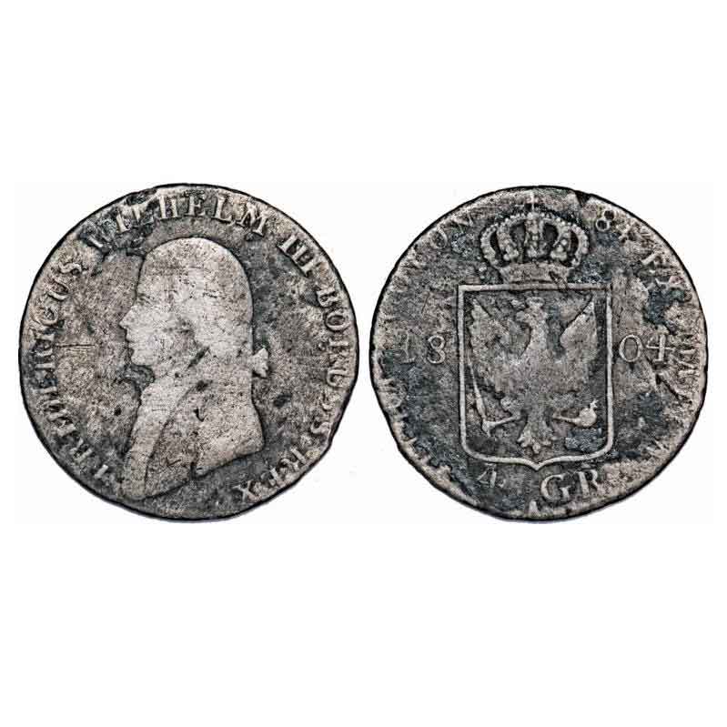 Prussia, Silver (0.5214% ), 4 Groschen, 4.28g, Friedrich Wilhelm III (1797-1840 AD) 1804. KM 370. Fine+, Very Scarce.