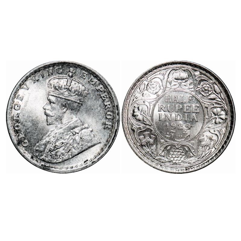 George V, Silver, Half Rupee, 1929, Calcutta Mint, No dot, Ghost on Rev. F. Prid 331. GK 1071. Uncirculated. Very Scarce.