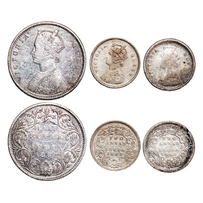| Victoria Queen, Silver, 1862, (3 coins), 1) Half Rupee, Bombay Mint, B1/II, Round Pearls, Five petals, Raised veins in centre of the petals, 2) 2 Annas, Bombay Mint, A/I, Bottom flower top 3 petals of same size, 3) 2 Annas, Madras Mint, A/I, Bottom flower centre top petal broader then left and right conneting petals. F. Prid 258, 486, 487. GK 371, 382, 384. Fine to Extremely Fine+. Scarce. |