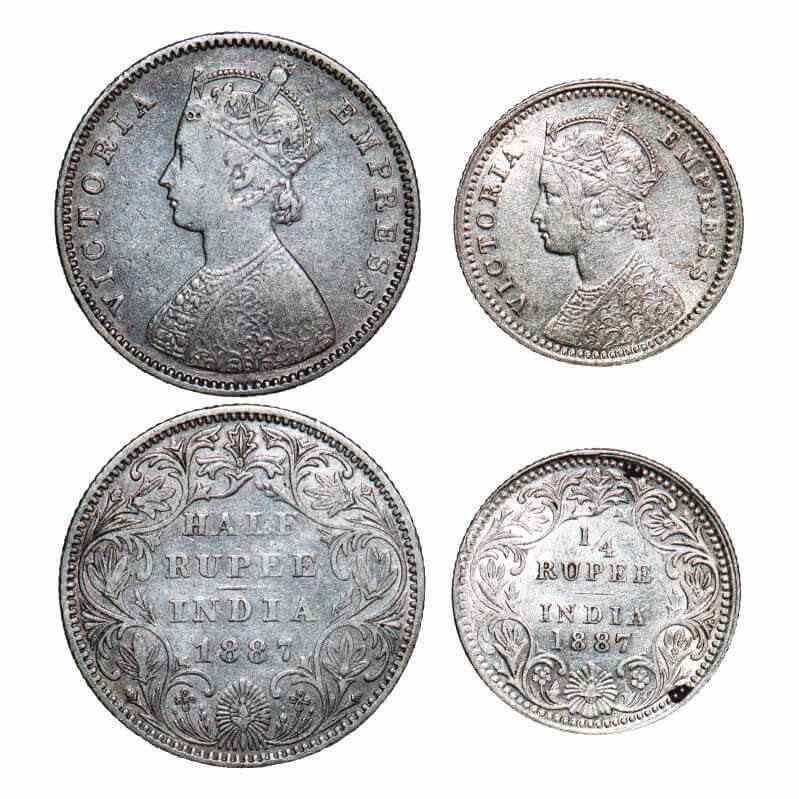 | Victoria Empress, Silver, (2 coins), 1887, 1) Half Rupee, Bombay Mint, A/II(i), ‘B’ raised, Big ‘B’, 2) 1/4 Rupee, Calcutta Mint, C/II, ‘C’ incused. F. Prid 296, 392. GK 636, 710. Very Fine+ to Almost Uncirculated. Very Scarce. |