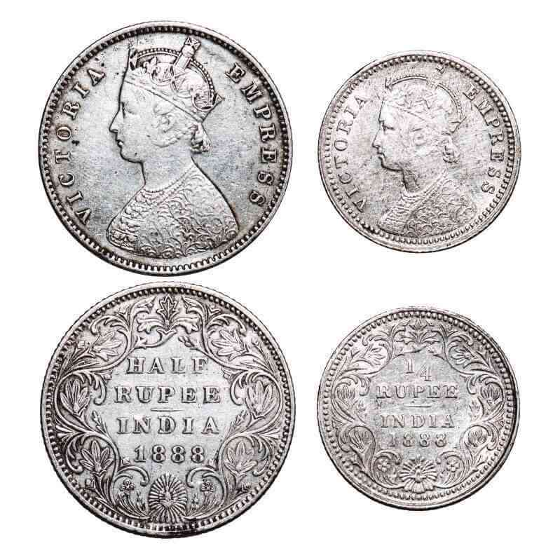 | Victoria Empress, Silver, (2 coins), 1888, 1) Half Rupee, Bombay Mint, A/II(i), ‘B’ raised, Big ‘B’, 2) 1/4 Rupee, Calcutta Mint, C/II, No mint mark, No ‘C’. F. Prid 298, 393. GK 640, 713. Extremely Fine to Extremely Fine+. Very Scarce. |