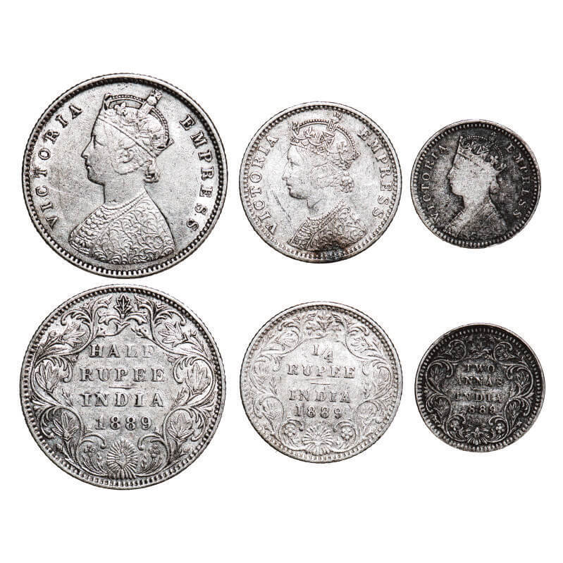 | Victoria Empress, Silver, (3 coins), 1889, 1) Half Rupee, Bombay Mint, A/II(i), ‘B’ raised, 2) 1/4 Rupee, Bombay Mint, C(i)/II, ‘B’ incused, 3) 2 Annas, Calcutta Mint, B/II, ‘C’ incused. F. Prid 299, 423, 504. GK 642, 715, 788. Very Fine+ to Extremely Fine. Very Scarce. |