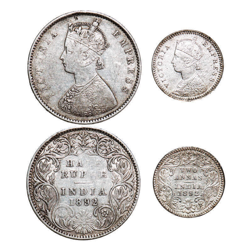 | Victoria Empress, Silver, (2 coins), 1892, 1) Half Rupee, Bombay Mint, A/I, ‘B’ incused, 2) 2 Annas, Calcutta Mint, B/II, ‘C’ incused, Ghost on Rev. F. Prid 302, 507. GK 646, 797. Very Fine+ to Almost Uncirculated. Very Scarce. |