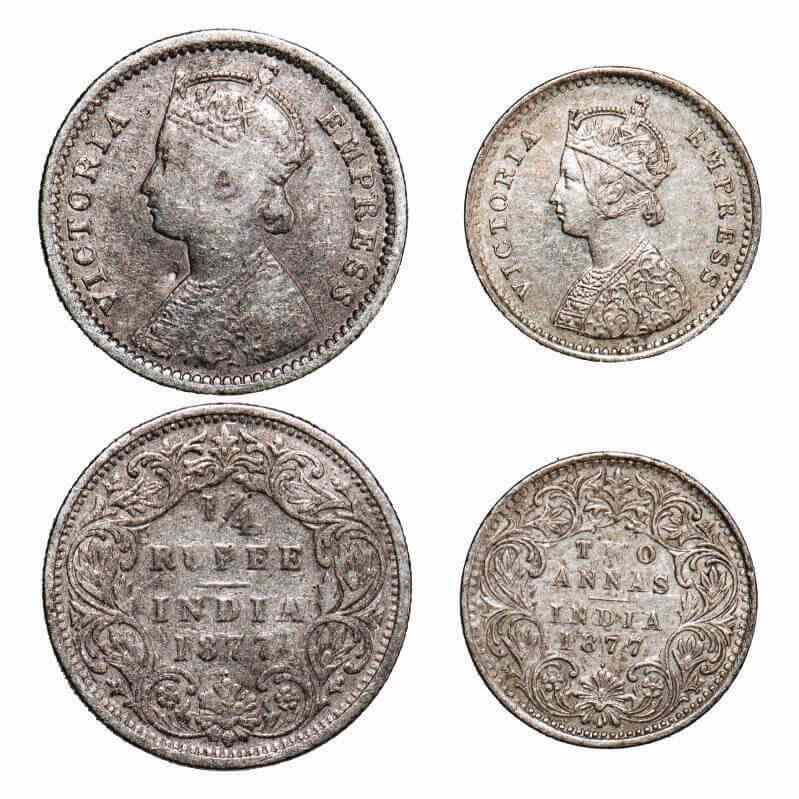 | Victoria Empress, Silver, (2 coins), 1877, 1) 1/4 Rupee, Bombay Mint, B/I, Dot, 2) 2 Annas, Bombay Mint, A/I, Dot. F. Prid 409, 520. GK 671, 746. Very Fine to About Uncirculated. Scarce. |